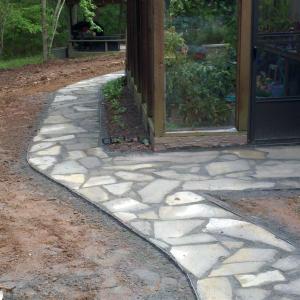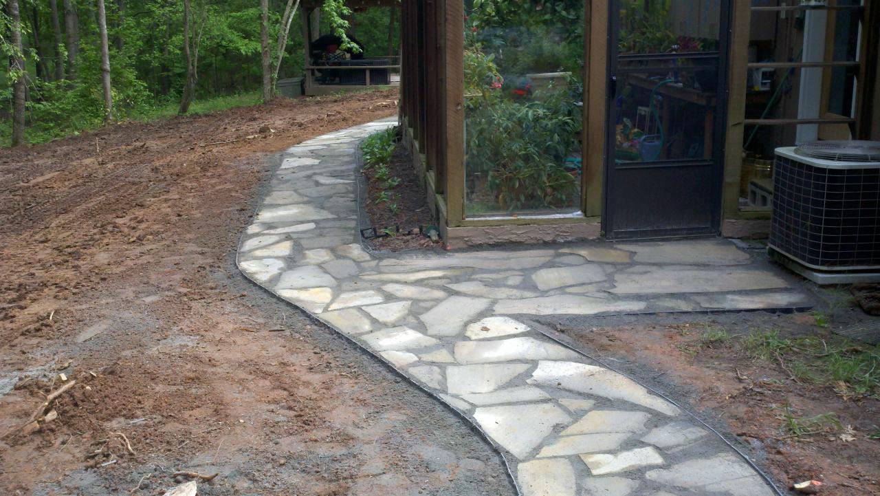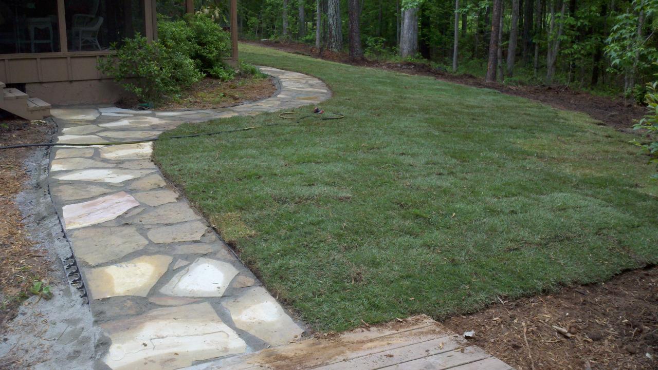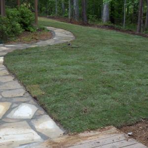 Installed flagstone walkway around perimeter of house and added Jamur Zoysia sod to enlarge the amount of usable yard.