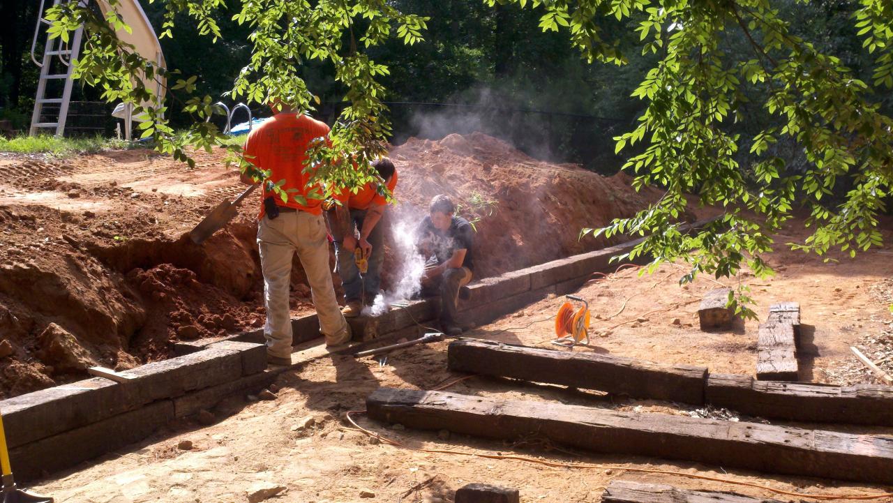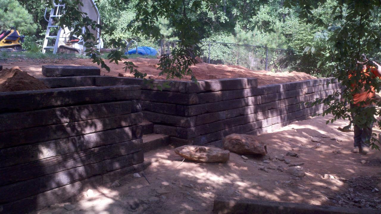 The homeowner had a swimming pool installed behind their house but was difficult to access because of large hill. We installed this crosstie wall with steps to prevent hill from eroding and to make access easier for homeowner.